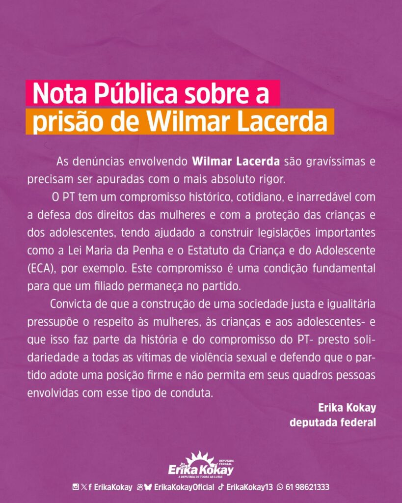 As denúncias envolvendo Wilmar Lacerda são gravíssimas e precisam ser apuradas com o mais absoluto rigor. O PT tem um compromisso histórico, cotidiano, e inarredável com a defesa dos direitos das mulheres e com a proteção das crianças e dos adolescentes, tendo ajudado a construir legislações importantes como a Lei Maria da Penha e o […]